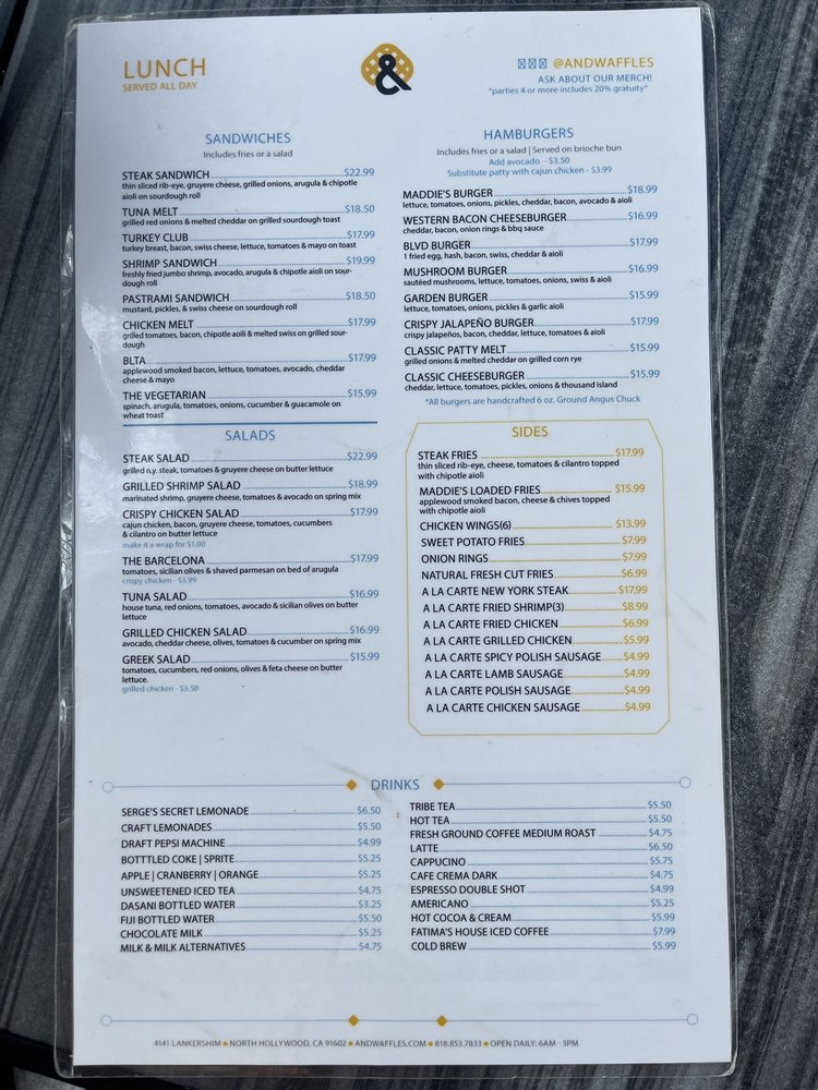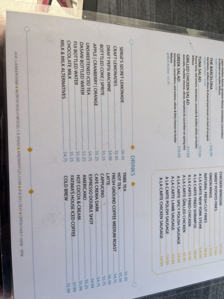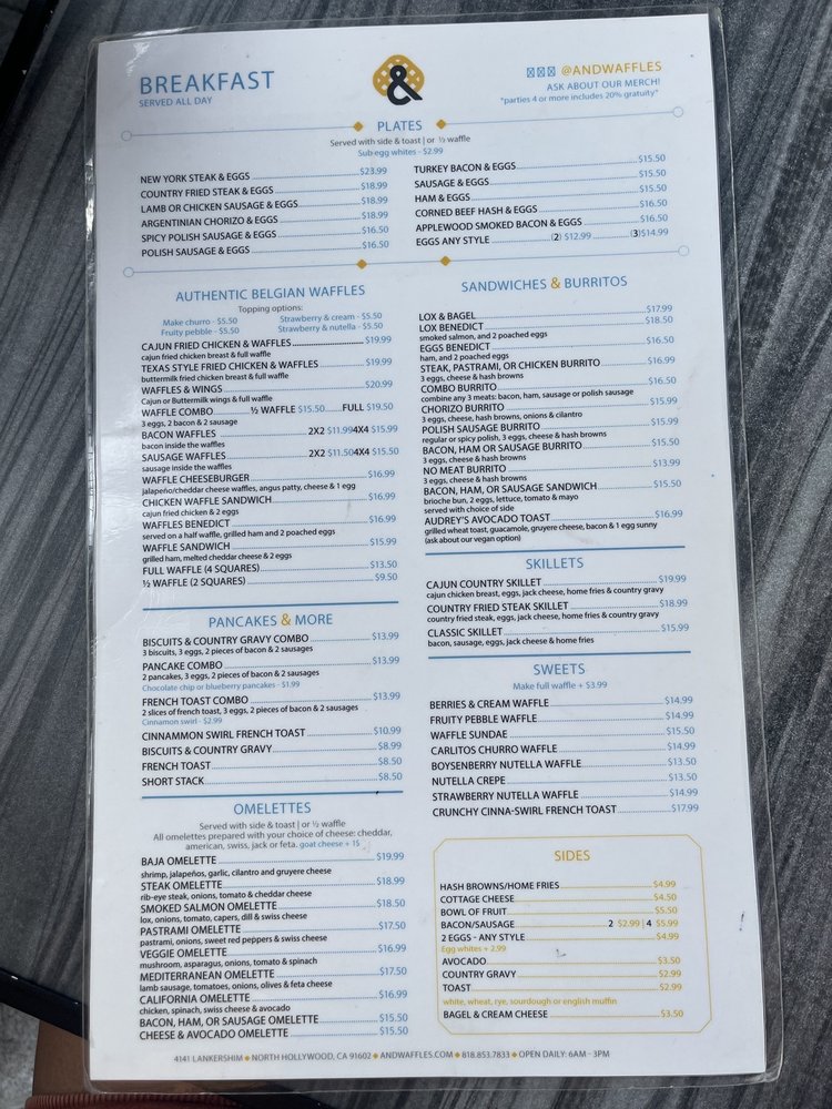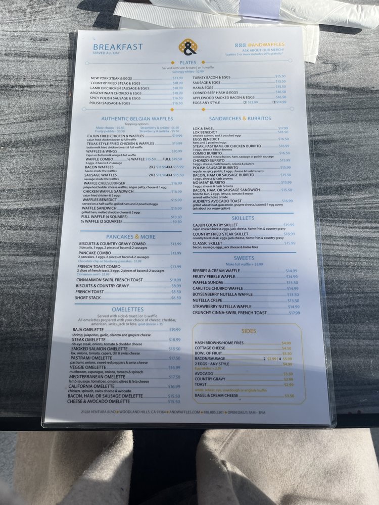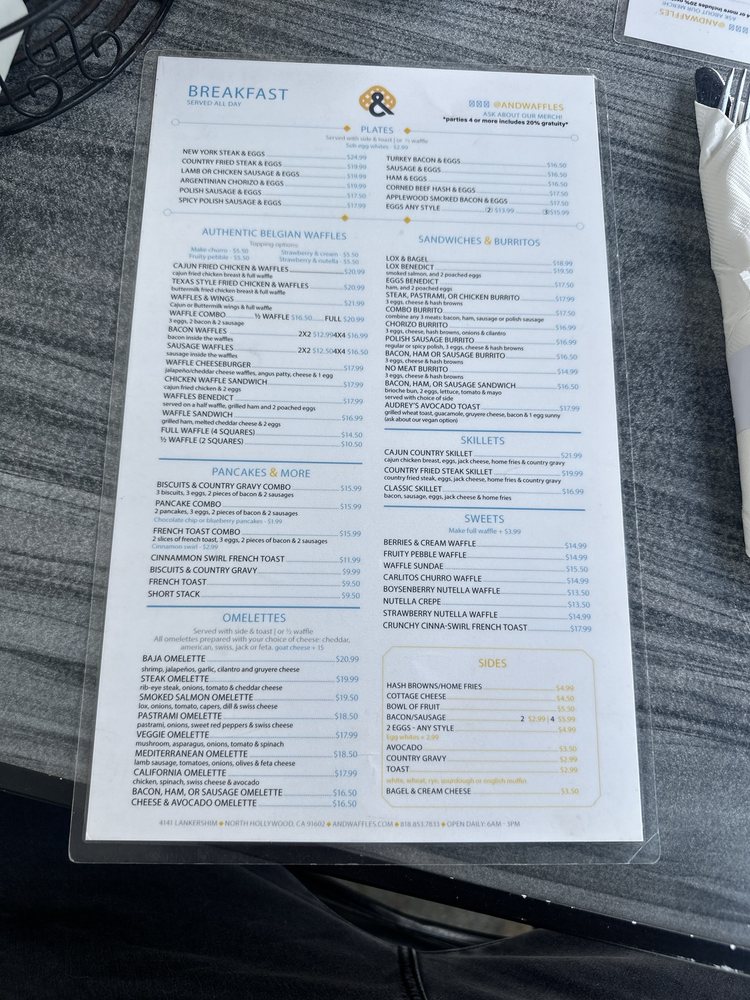 Introducing the menu at & Waffles located in North Hollywood, CA, this trendy establishment offers a range of options including breakfast plates, breakfast burritos, and authentic Belgian waffles with various toppings. The waffles are described as fluffy, moist, and crispy, with customers praising the flavors and textures. Dishes such as the Texas Style Fried Chicken & Waffles and Bacon & Waffles are standout favorites. The restaurant provides a welcoming atmosphere with friendly staff and quick service, making it a great spot for a delicious meal. With a focus on quality ingredients and fresh, made-to-order dishes, & Waffles offers a unique dining experience for anyone looking to indulge in satisfying breakfast and brunch options.
